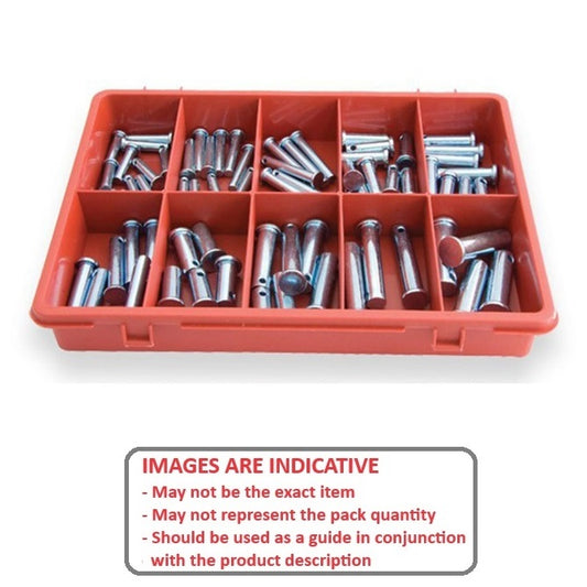 | SelectionClevis Pins | Quantity Per Kit83 | Description15 Sizes imperial in a metal drawer (no lid) | Contents1/4 diameter x 1 inch and 1.1/4 inch long - 10 of each | Also includes5/16 diameter x 1, 1.1/4, 1.1/2, 1.3/4 and 2 inch long - 5 each | Also includes3/8 diameter x 1, 1.1/4, 1.1/2, 1.3/4, 2, 2.1/2 inch long - 5 each |   |