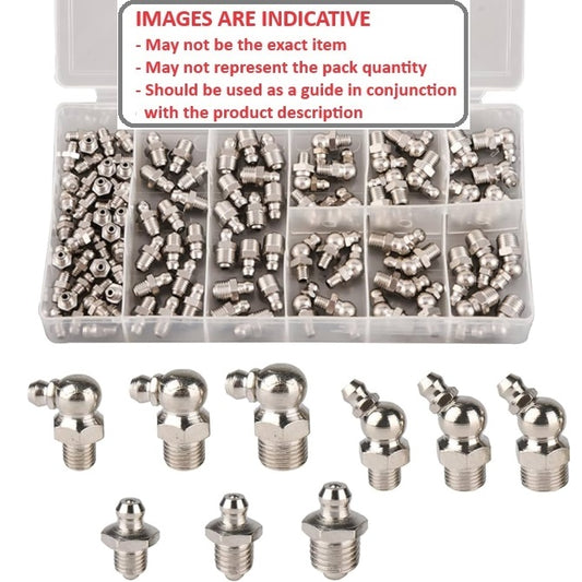 | SelectionGrease Nipples | Quantity Per Kit100 | DescriptionMetric | Contents6mm Str (30) | Also includes6mm 45 and 90 Deg (10 each) | Also includes8mm Str (20) |   |