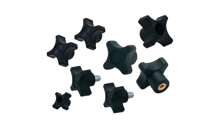 A selection of Male Cross Knobs. Black Plastic Knob with thread.4 Prong...